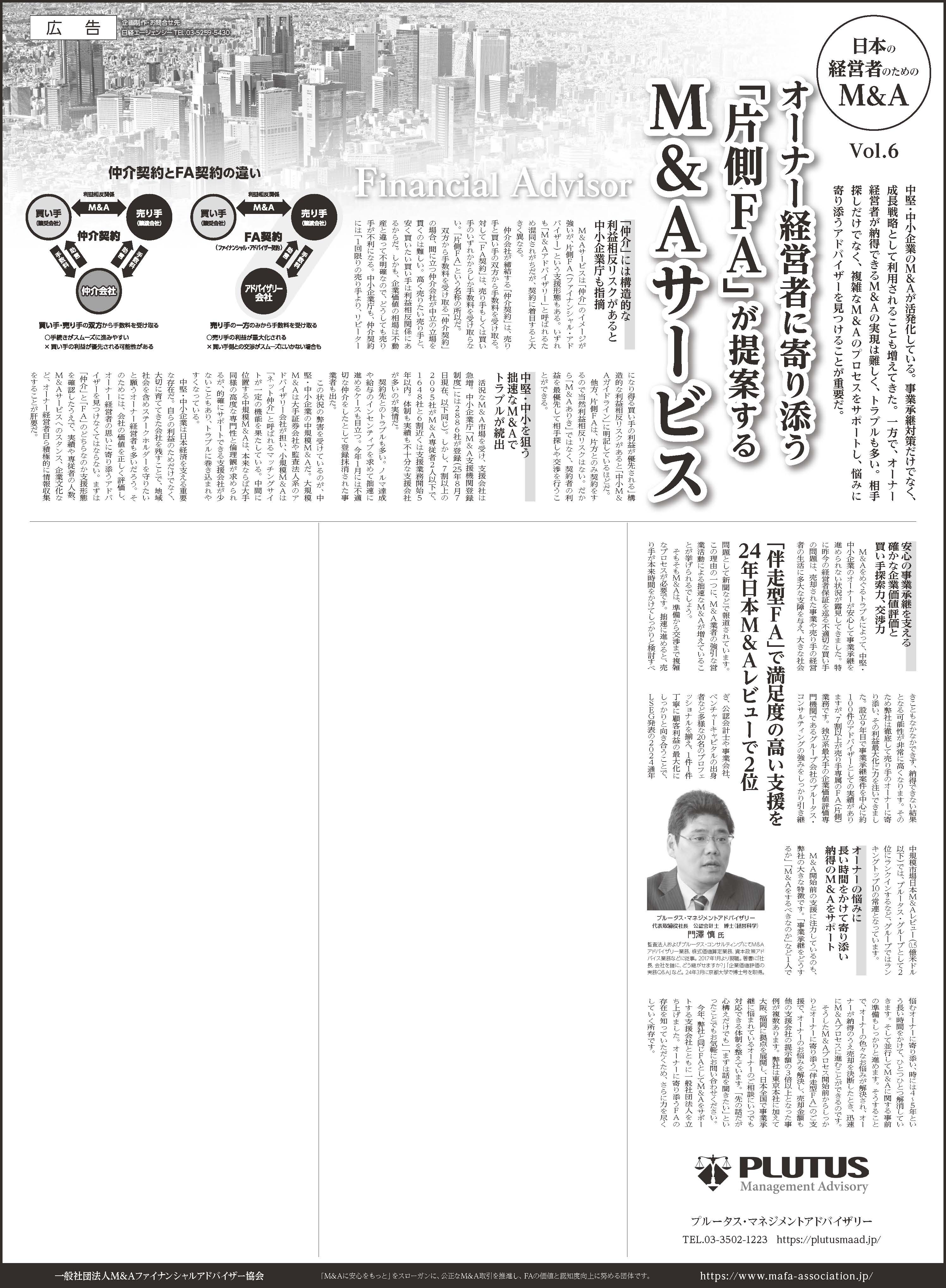 2025年8月20日刊行の日本経済新聞【日本の経営者のためのM&A Vol.6 】『オーナー経営者に寄り添う「片側FA」が提案するM&Aサービス』に弊社代表取締役社長 門澤の記事広告が掲載されました。